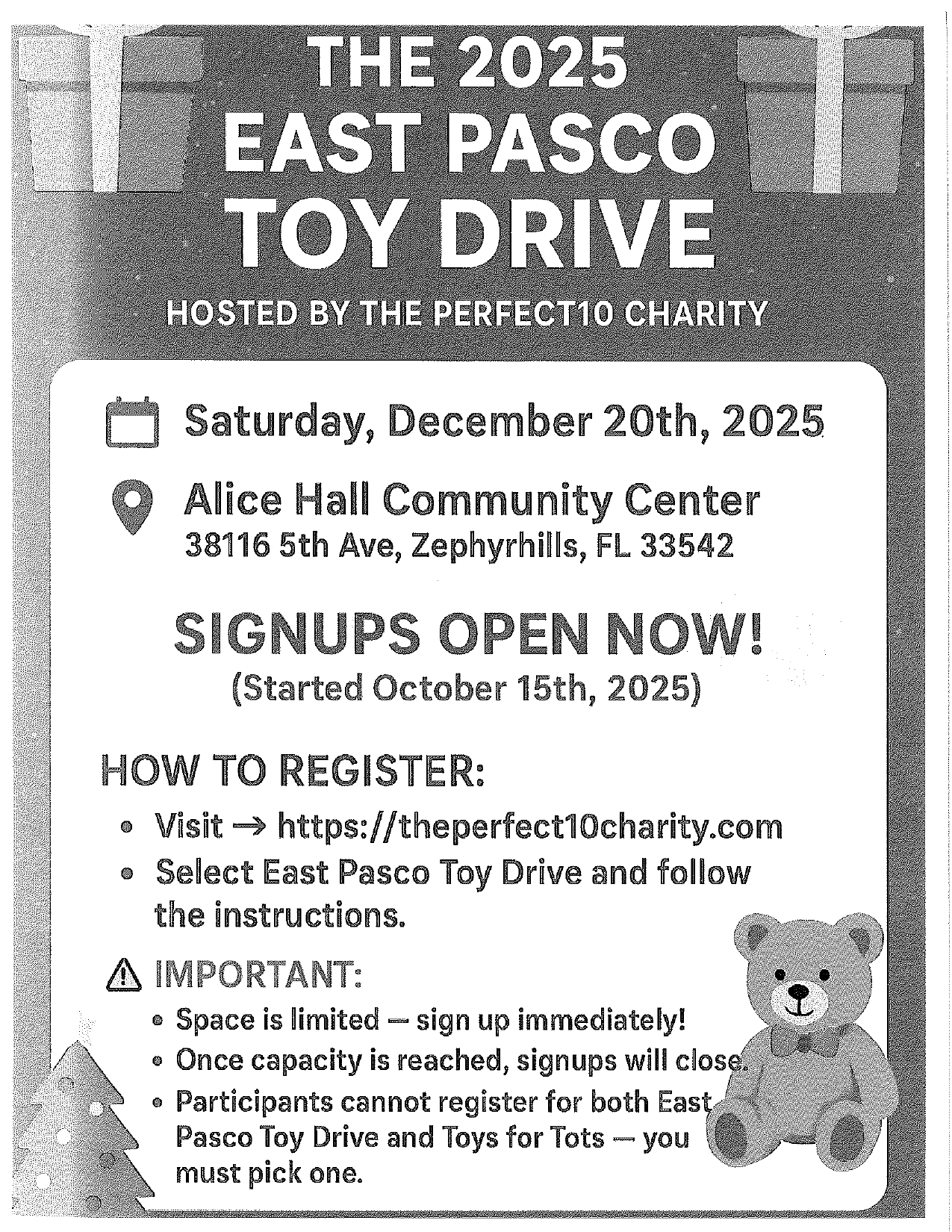 Participants cannot register for both East Pasco Toy Drive and Toys for Tots – you must pick one.